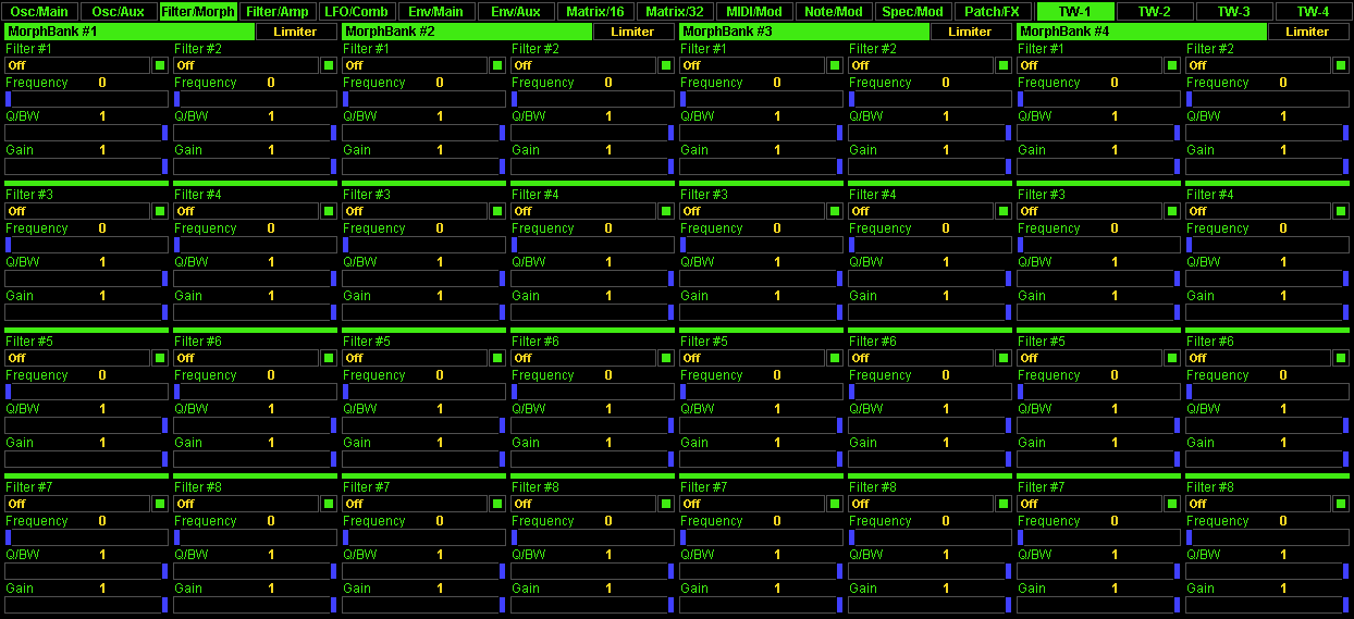 Filter Chaining, Filter FM, Comb Filters, extensive modulation capabilities, WaveShaping, freely drawable Contour Generators, exhaustive FX section including quad-channel Chorus/Flanger, Phaser, Delay and Reverb units, etc, etc.